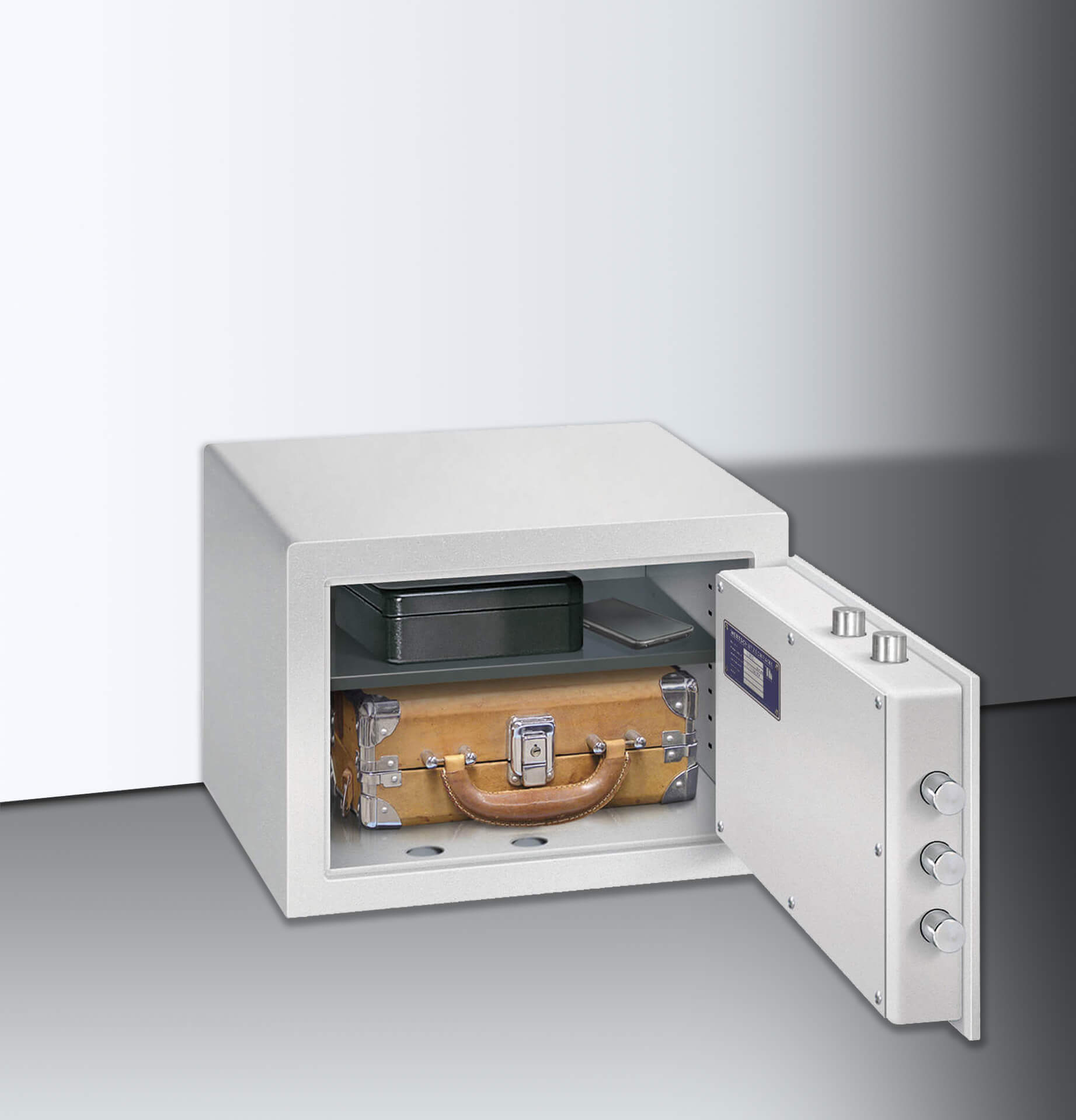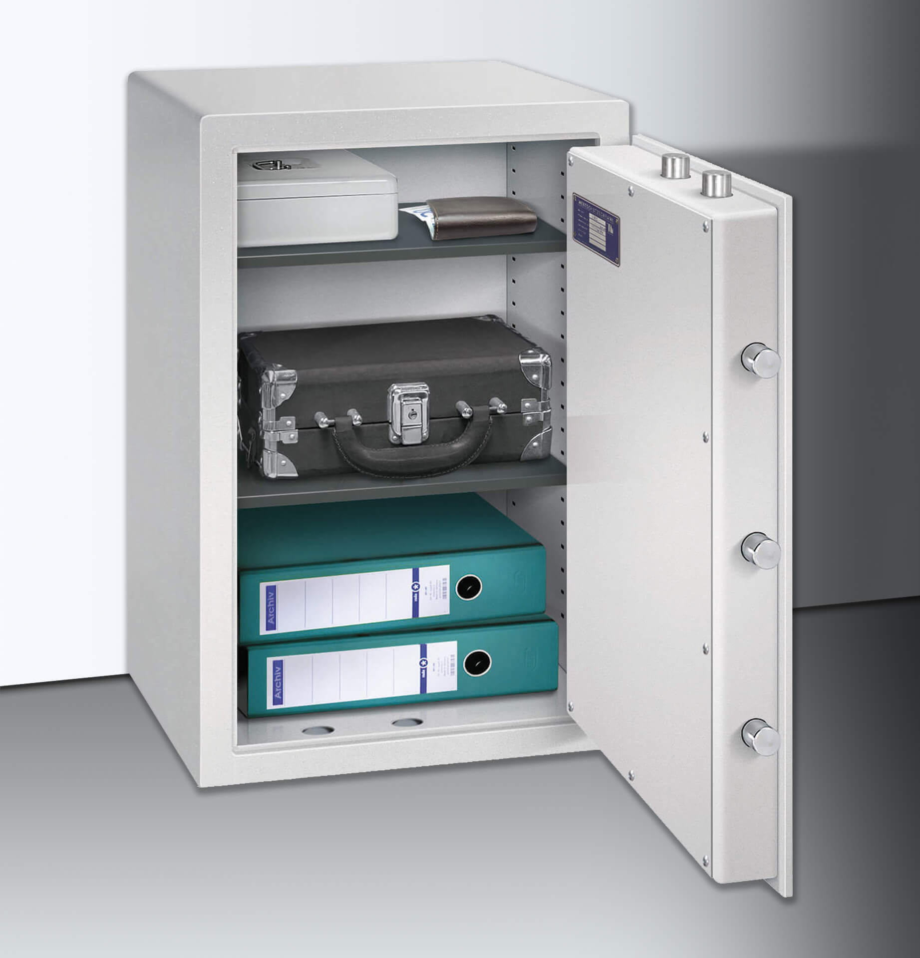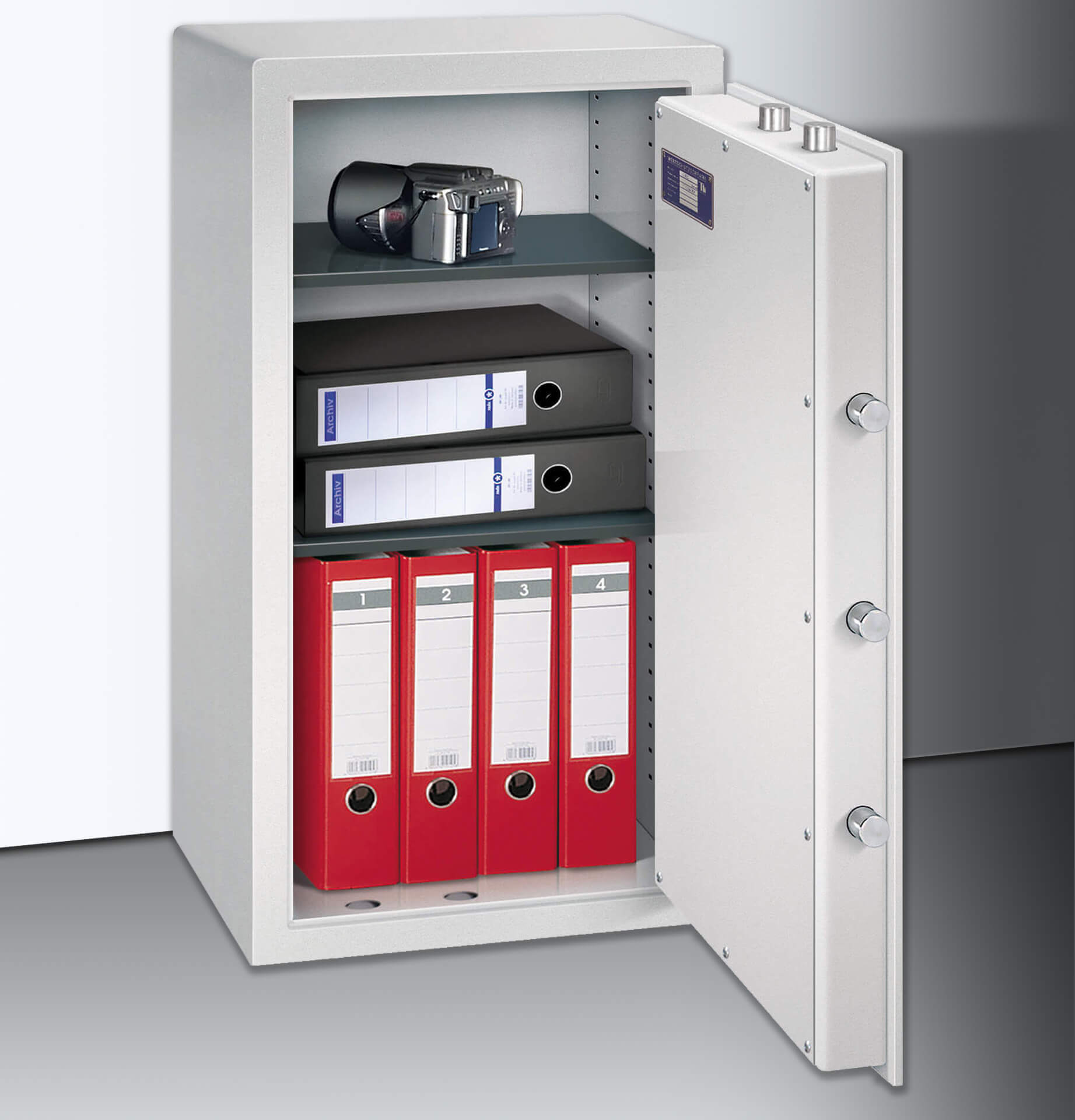 - Wahlweise mit Doppelbart-Sicherheitsschloss inklusive 2 Schlüssel oder einem nach EN 1300 zertifizierten elektronisches Schloss (inkl. Batterien)