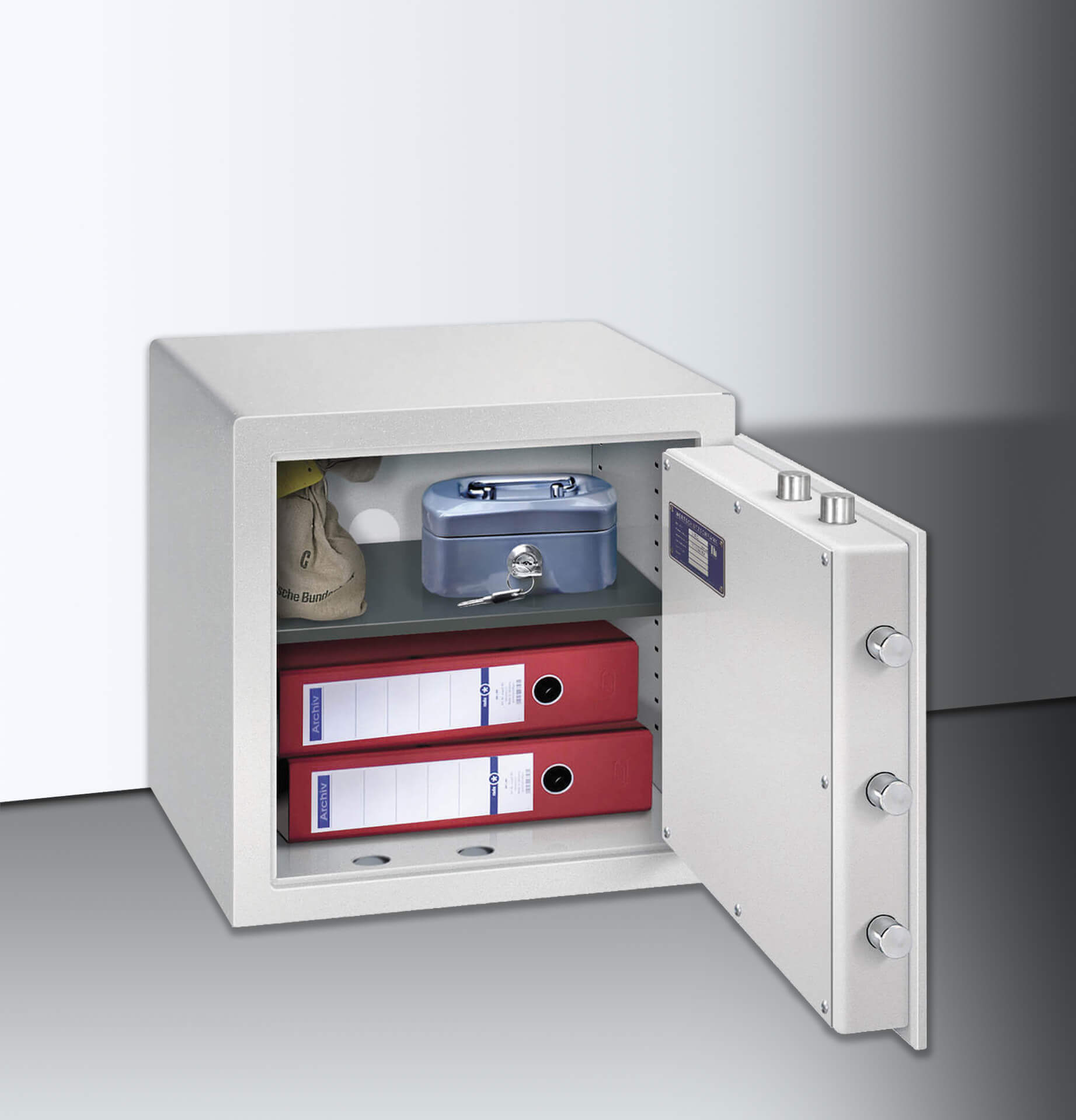 Deutlich sicherer sind die Modelle der EM-Serie. Der Widerstandsgrad I. Dieser ergibt sich aus der Widerstandszeit gegen Zugriff durch mechanische und thermische Werkzeuge. Es wird zum einen getestet, wie lange man braucht um beispielsweise ein Loch in den Tresor zu bohren und zum anderen eine Vollöffnung durchzuführen.Gezielte Aufbruch- und Manipulationsversuche am Schloss runden die umfangreiche Prüfung ab. Zusätzlich zum unsichtbaren Aufstellort schützen sie sehr gut gegen Einbruch. Wahlweise liefern wir den Tresor mit elektronischem Tastenkombinationsschloss oder Doppelbart-Sicherheitsschloss.